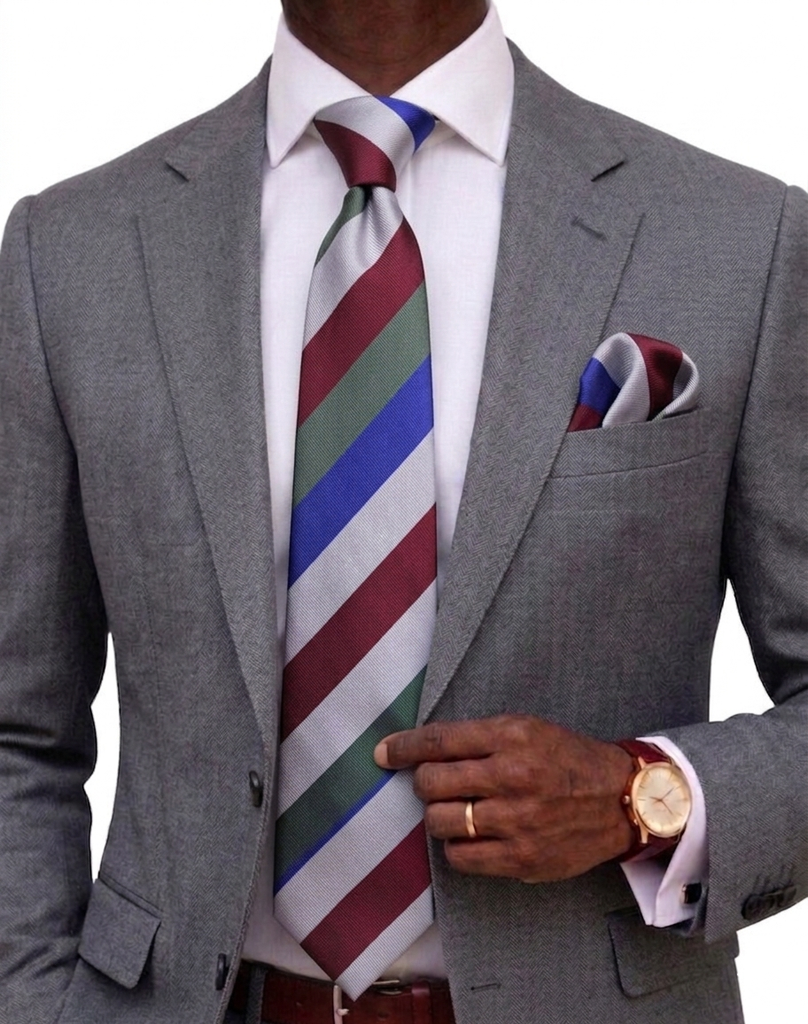 Egyptian Stripe A1 | Silver/Wine/Royal/Grey | Tie & Pocket Square