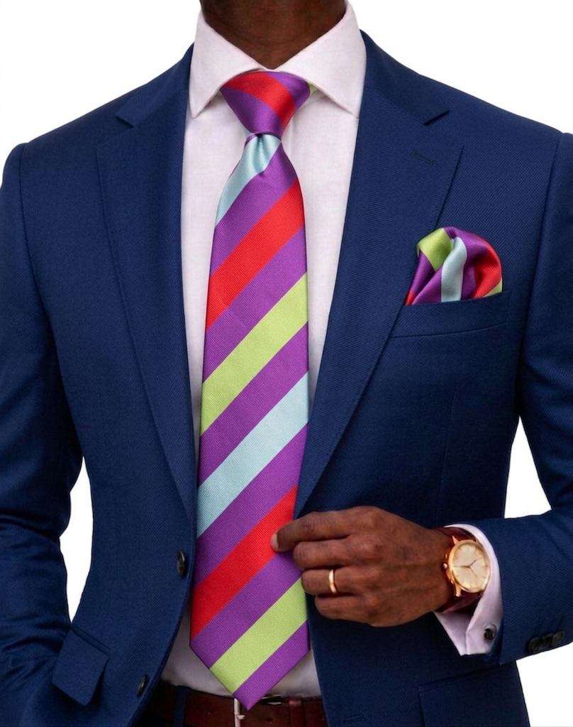 Egyptian Stripe A10 | Violet/Lime/Red/Teal | Tie & Pocket Square
