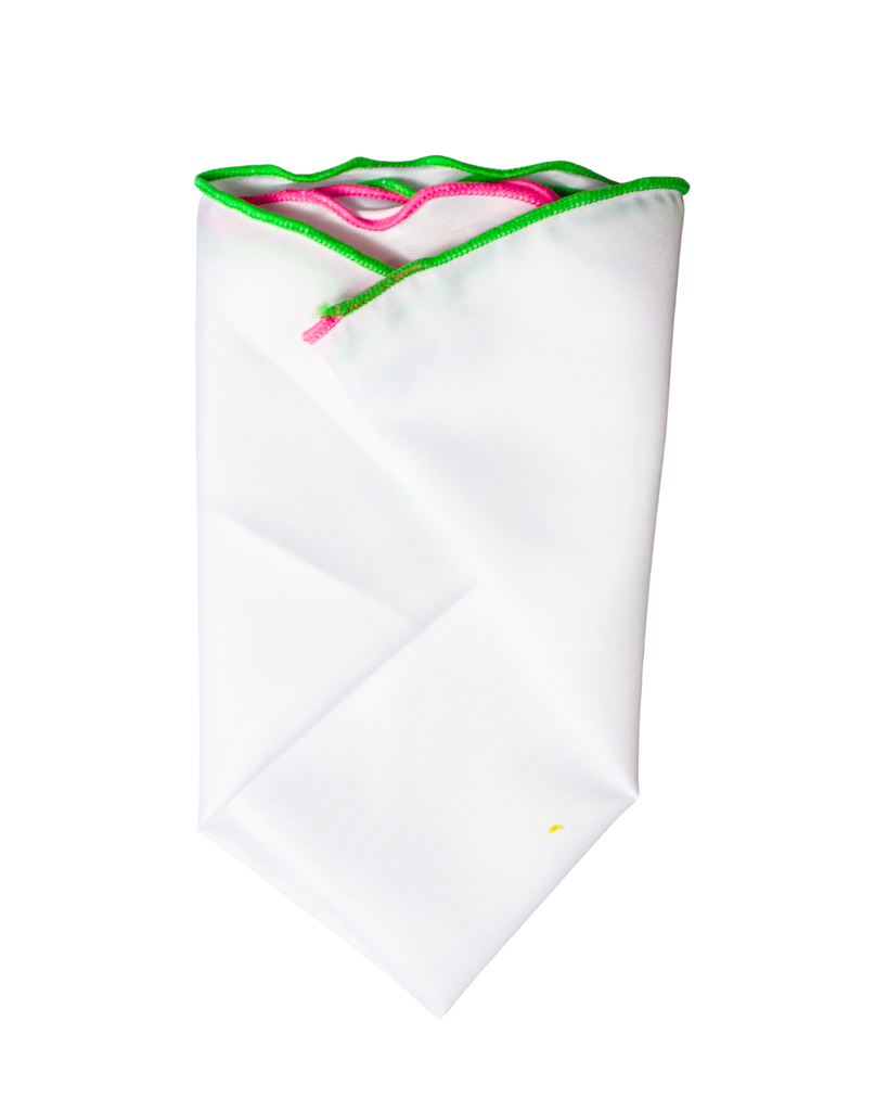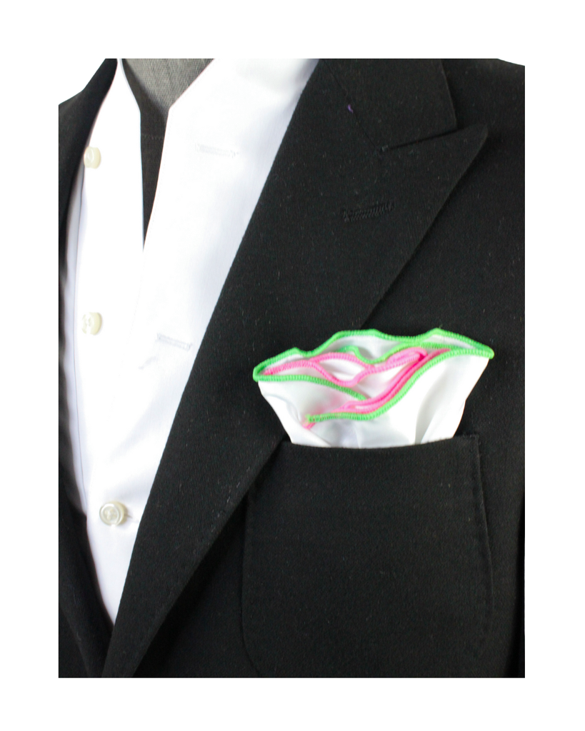 White Silk/Satin Round Pocket Square w/ Pink & Lime Trim