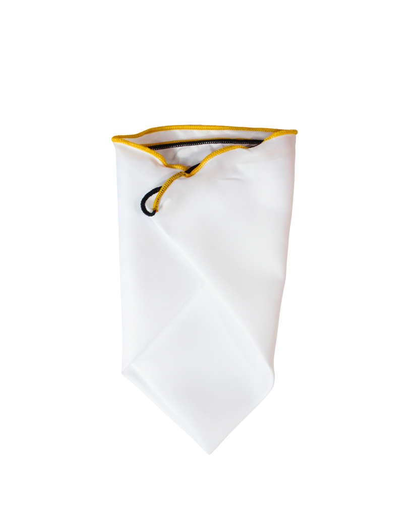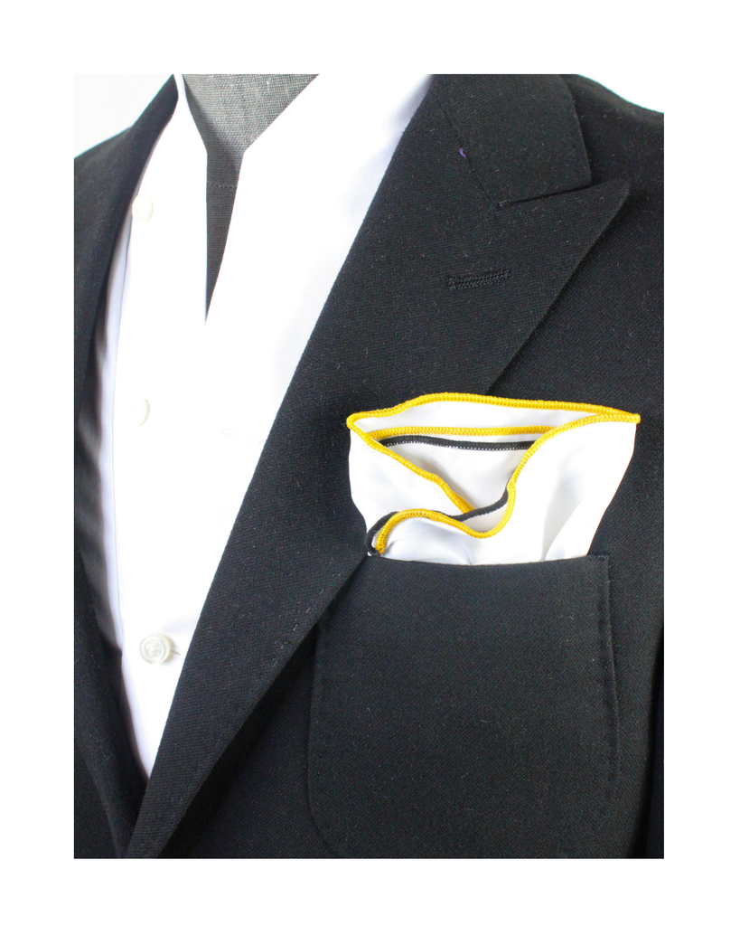 White Silk/Satin Round Pocket Square w/ Blk & Gold Trim