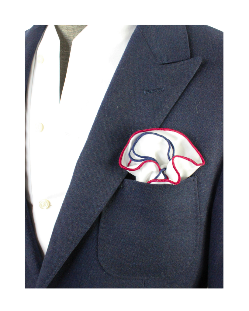 White Silk/Satin Round Pocket Square w/ Navy & Red Trim