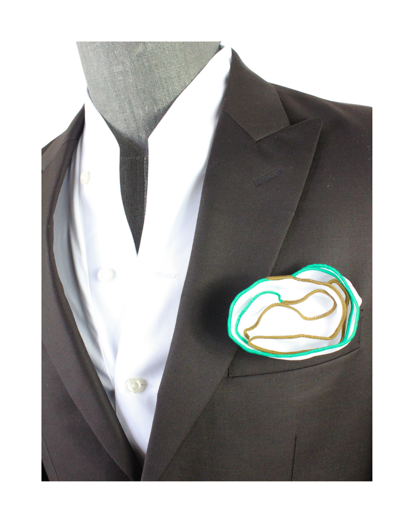 White Silk/Satin Round Pocket Square w/ Green & Taupe Trim
